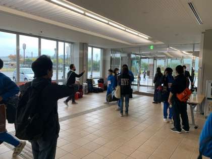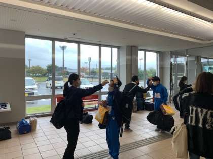民泊から帰ってきて、検温・消毒をして体育館に入っています。