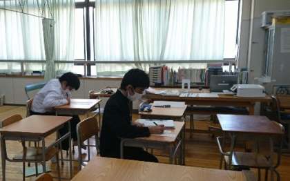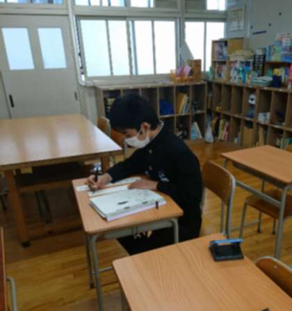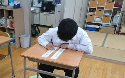 作品は、東中学校の文化発表会や、大阪市役所で開催予定の生徒作品展で展示する予定です。生徒たちは緊張しながら清書をしていました。