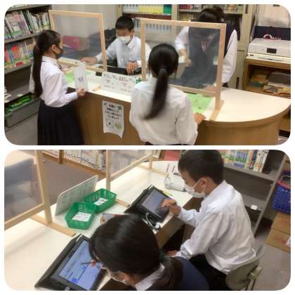 図書館では、学校元気アップのボランティアの方々に見守られて、図書委員が図書の貸出などの仕事をしています。