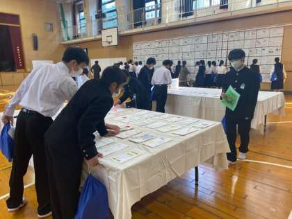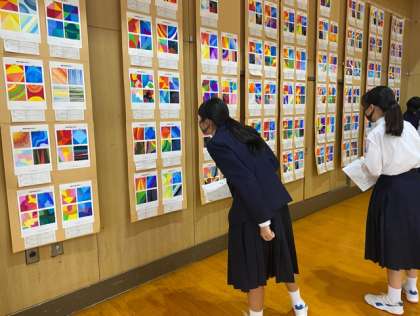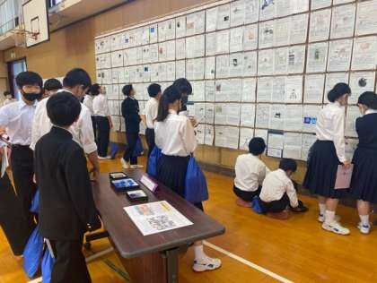 体育館には、授業や部活動で作成した作品がたくさん展示されており、みんなとても興味深そうに見学をしています。