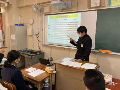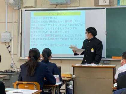 3年生の2時間目は各学級の情報機器実行委員さんが各教室でスマートフォン、SNSの活用などについて大阪の中学生を対象にしたアンケート結果を発表してくれています。
