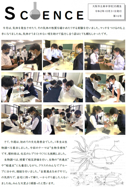 10月は、気体を発生させたり、その気体の性質を確かめたりする実験を行いました。マッチをつけるのも上手になりましたね。気体がうまくとれない班を助けて協力し合う姿はとても頼もしかったです。