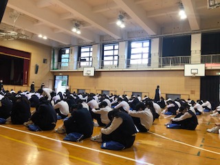 体育館では一年生集会の準備が行われています。