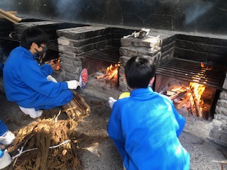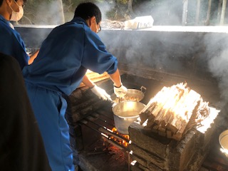 燃え盛る炎と格闘しながら、カレーとご飯を作っています。