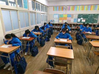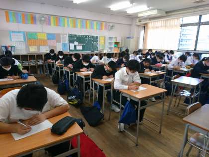 校外学習から帰校した1・2年生の部員たちは、ソフトテニスのルールや審判の確認プリントに取り組んでいます。