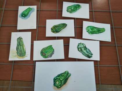 今日はピーマンをモチーフに、何枚か練習しました。水分のコントロールや色の重ね方がポイントです!