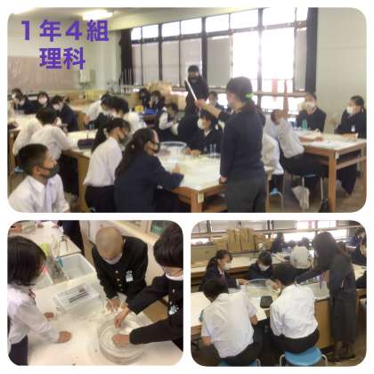 4組では、大阪教育大学より教授先生に参観いただいての授業。「なぞの粉末と液体」から発生する気体を予想してから、実験で確かめ、確認し、レポートにまとめる公開授業。授業中にレポートを完成までめざす内容の濃い授業でした。理科の授業を通して科学的思考を育むことをめざしています。