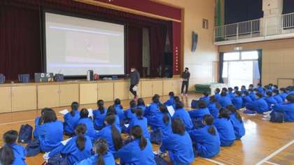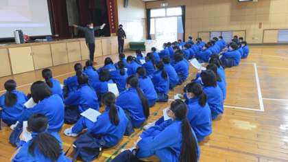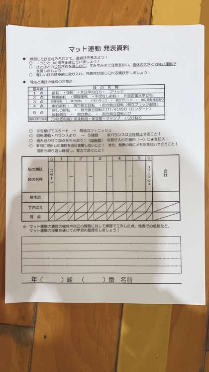 前転、後転などの基本技のテストを終え、次は連続技の発表に向けた説明がされています。
