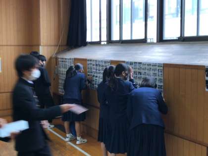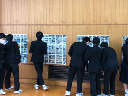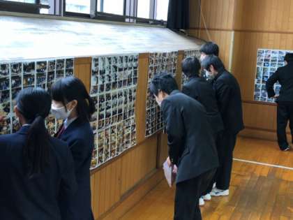 3年生はクラスごとに時間を分けて、多目的室で修学旅行と体育大会の写真を見ています。