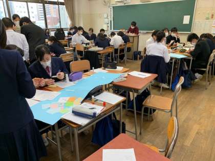 校外学習の振返りの新聞を班ごとに作成しています。