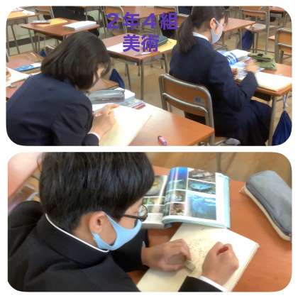 4組は美術、美術室にある本を参考に、絵・イラストの作成に取り組んでいます。