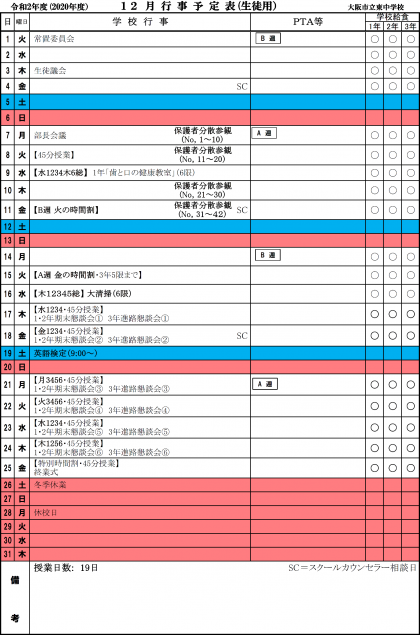 12月の行事予定です。12月25日(金)終業式、26日から1月6日までが冬季休業です。保護者分散参観(7・8・10・11)、進路懇談会(3年生)・期末懇談会(1・2年生)(17〜24)などが予定されています。
