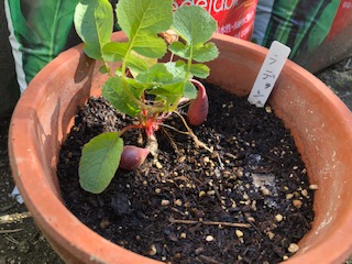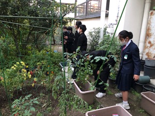 スケッチの後は、庭の手入れをしました。雑草を抜き、花の植え替えを行いました。ラディッシュとトマトはそろそろ収穫です。楽しみですね。