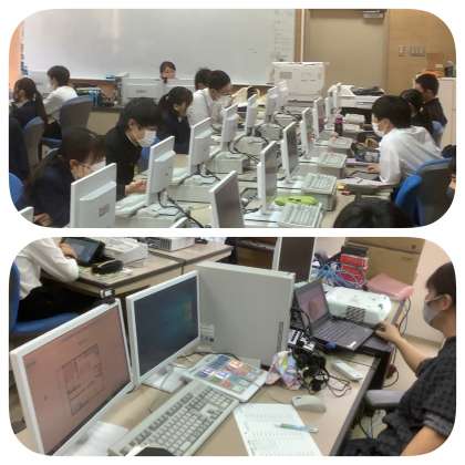 パソコン教室でお互いの作品を鑑賞し、1「是非住んでみたい」、2「まぁまぁかな」、3「う〜ん」で投票。すぐにスクリーンで共有していきます。担当の先生は複数のパソコン画面を操作して、生徒たちの作品をテンポよく鑑賞していきます。