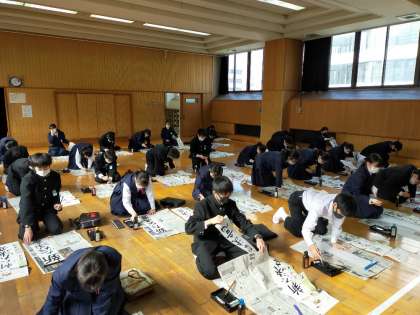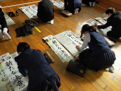 多目的室にて、書初用紙に「新たな決意」と書写しています。