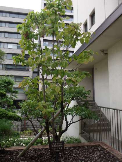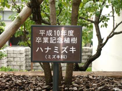 銘板には、「平成10年度 卒業記念樹 ハナミズキ ミズキ科」とあります。実は校内にはもう1本ハナミズキがあり、以前ご紹介した平成3年度卒業記念樹がそうです。どうやら年度は違いますが、玄関前の階段を挟んで東西に配置して植樹されたことが分かります。今年も桜の後に、来校者の目を楽しませてくれるでしょう。