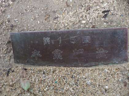 銘板には「第15回卒業記念」とのみ書かれています。樹木はご覧のとおり立派なクスノキです。本校の運動場の東側、家庭裁判所との塀沿いに4本植樹されております。