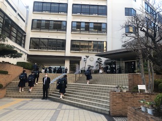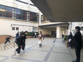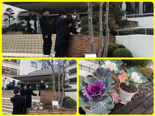 朝からガーデニング部が、葉牡丹の鉢植えを設置しました。玄関に彩りが加わって、明るい気分になりますね。