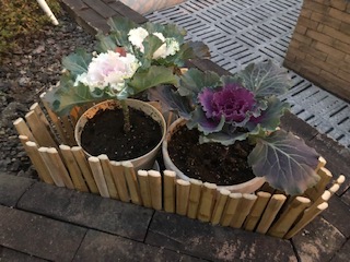 ガーデニング部の飾った鉢植えの周りに、管理作業員さんが杭を打ち込んで下さいました。雰囲気が出てお洒落ですね。みんな集まって見ていました。