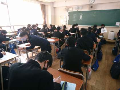 配布プリントや課題の確認をしています。連絡事項もしっかりとメモをとりながら聞いています。