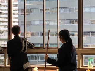 放課後教室掃除をしていると、雪が降り始めました。今日はとても寒かったですね。「見て見て!」と言いながら、笑顔で掃除をしていました。