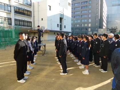 今朝はこの冬一番となる冷え込み。吹く風もとても冷たく、寒々とした中でしたが、生徒会の進行の元、全校集会が行われました。