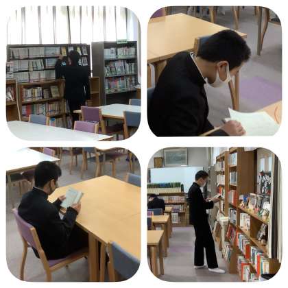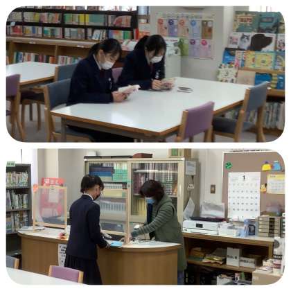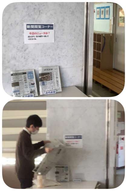 暖房を入れて部屋を温めて、生徒の来館を待っていただいている元気アップのボランティアの方々。生徒は「読みたい本がたくさんあるから時々きます」。新聞閲覧コーナーでは「大学入学共通テスト」の問題を見ているのでしょうか、先生が新聞を閲覧している姿もありました。