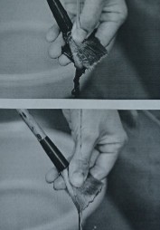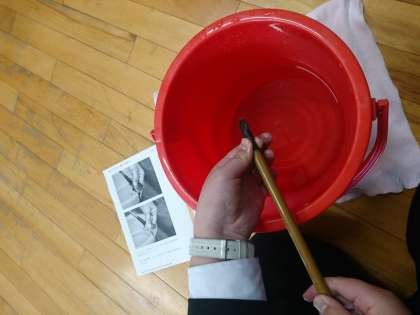 はじめに道具の確認から行いました。墨で固まってしまった筆をやさしく洗い、毛流れにそって整えました。