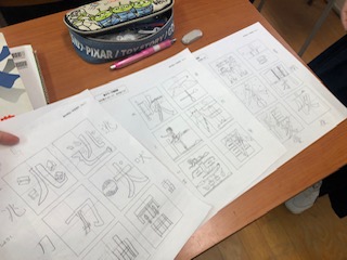 美術の授業では「へ〜んしん!」と題して、レタリングした字と、その「字」の意味を表す「絵」を組み合わせて描いています。