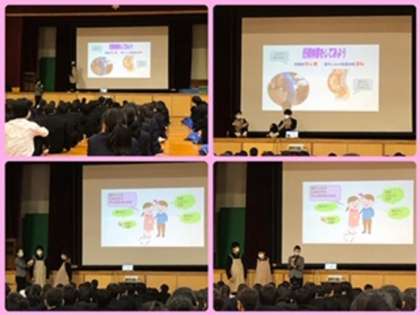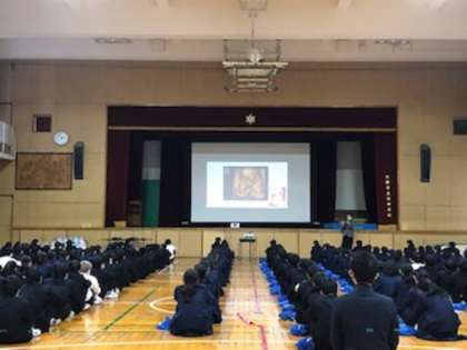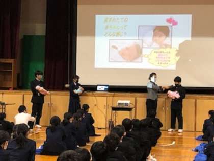 助産師さんにお越しいただいて、性教育の授業がありました。代表生徒が妊婦体験をしたり、赤ちゃんの抱っこ体験をしたりしました。「命を預かる責任の重さを、赤ちゃんから感じてもらいたいです」と仰っていました。