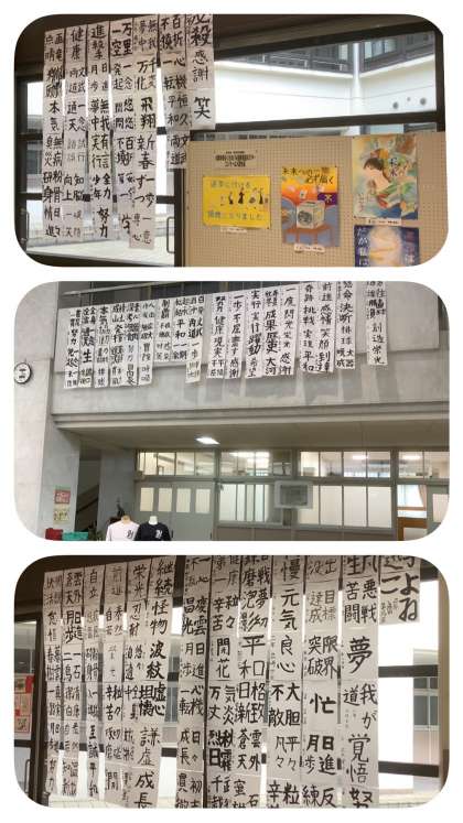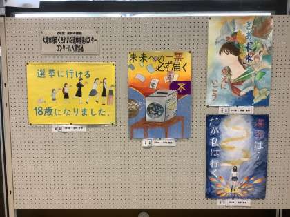 玄関ホールには、2年生の書初めと、先日、放送で伝達表彰をした「大阪市明るくきれいな選挙推進ポスターコンクール」で見事に入選したポスターなどが掲示されています。