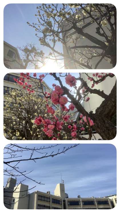 正門の梅が見頃を迎え、運動場の桜は開花の準備をしています。