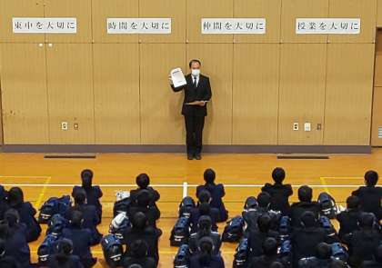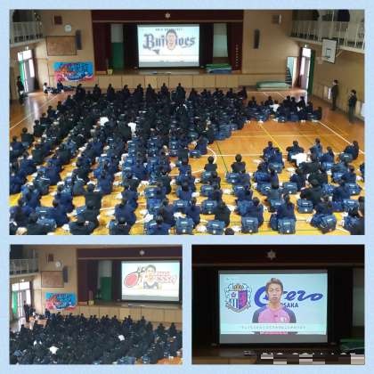 学校長の講話において、その取組の第2弾として、『舞洲プロジェクト』の全体視聴に加えて、先日の部活動部長会議の取組を教育委員会事務局のみなさんにより、経済戦略局やプロ3団体へ部長たちのメッセージを届けていただいたことの報告がなされました。