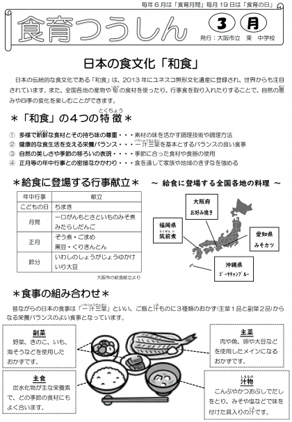 3月の食育通信では「日本の食文化『和食』」についての記事が掲載されています。