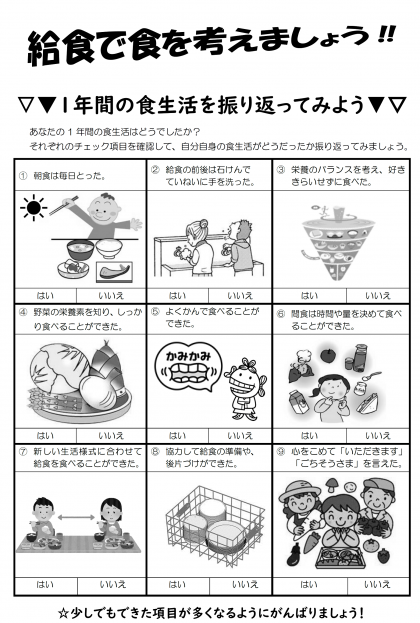 「給食で食を考えましょう!!」は「1年間の食生活を振り返ってみよう」のチェックシートです。1年間の食生活を振り返ってみましょう。