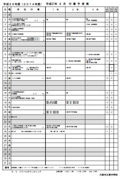 3月の行事予定表をアップしました。予定表の右端の学校給食配膳日もチェックしておいてください。 「配布文書」−「行事予定表」にもアップしております。
