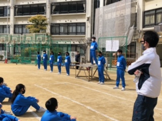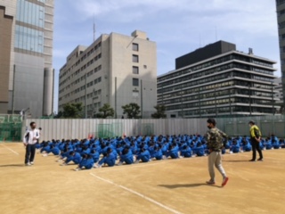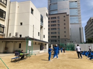 晴れた空の下、球技大会が始まります。競技はドッヂボールです。メリハリをつけて、素早く準備ができました。