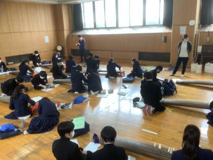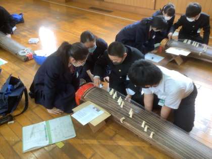 多目的室に箏を十面並べて「さくらさくら」の練習に取り組みました。グループごとに練習を行った後は、十面で合奏。はじめての合奏でしたが、演奏後、拍手が沸き起こりました。