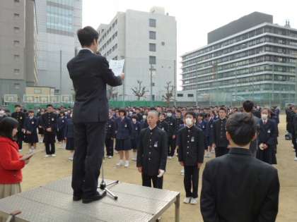 今朝は気温も少し高く、穏やかな太陽の光りの中、生徒会の進行の元、全校集会が行われました。(昨日は3年生の公立前期選抜のため本日の開催となりました)