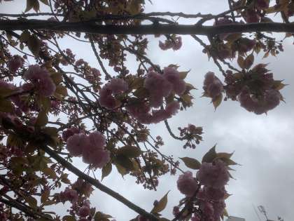 入学式を終え、運動場の桜は葉桜へと模様替え。濃い色の花の桜は、満開を迎えようとしています。始業式まで花があればいいのですが。