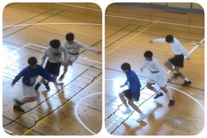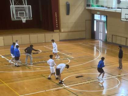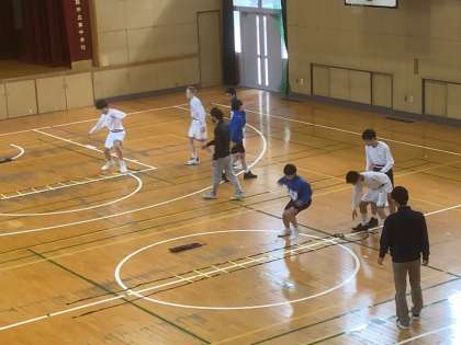 男子バスケットボール部が、これまで指導していただいている顧問の先生に加えて、4月よりお越しいただいた先生も加わり活動をしています。写真は新2年生のラダーを使ったフットワークの基本練習の様子です。