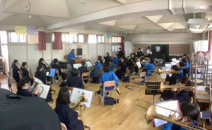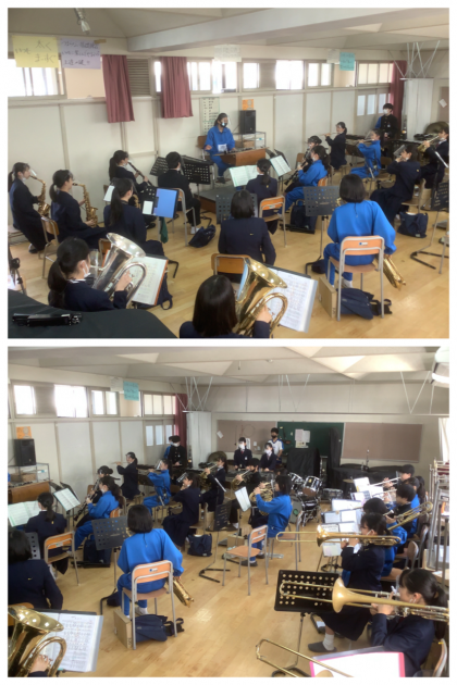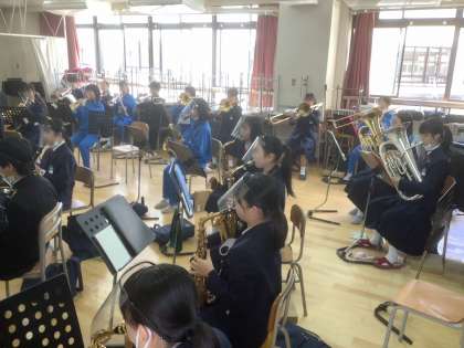 吹奏楽部は感染症対策として、フェイスシールドを付け、充分に換気をした音楽室での一斉練習と、各教室に分かれてのパート練習を組み合わせて活動しています。