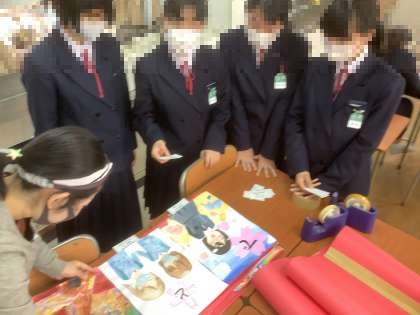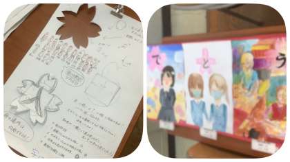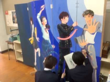 美術部が職員室前の多目的ホールに展示する共同作品の完成に向けて活動しています。一人一文字のポスターを繋げると新入生へのメッセージになっています。また、卒業生の作品も仕上がってきました。完成をお楽しみに!!