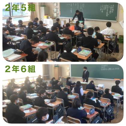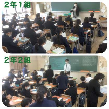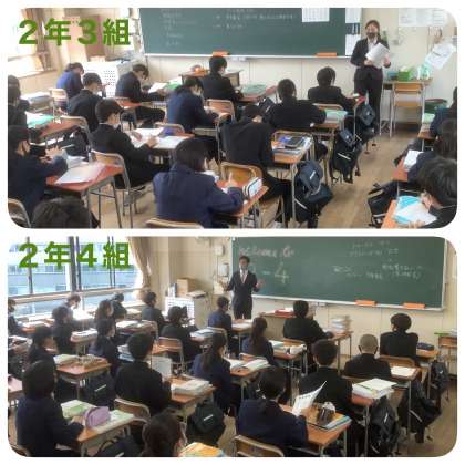 2年生の教室の様子です。プリントを配布したり、春休みの課題を回収したりしています。6クラス編成になったことで教室に余裕が生まれました。作業もスムーズです。