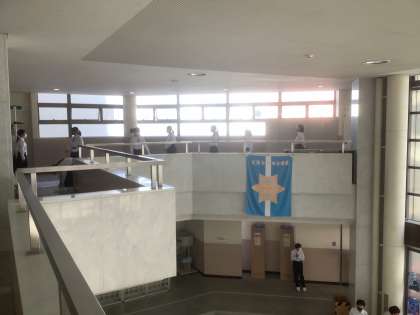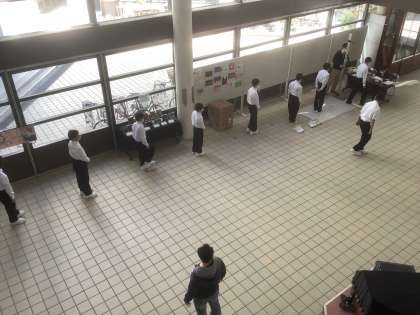 写真は、1年生の2測定のようすです。ソーシャルディスタンスを守り静かに順番を待っています。また、測定後は手洗いをしてから教室に戻ります。感染症対策をとりつつ実施しています。