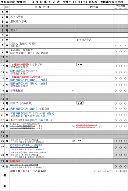 4月の行事予定表に変更点を加筆修正し、再配布しています。こちらをクリックしてご覧ください。