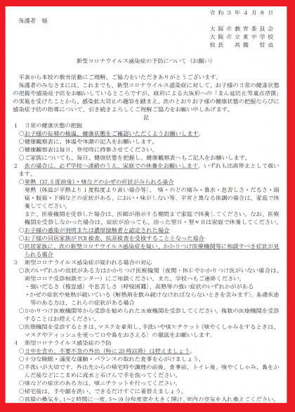 なお、ご相談がある場合は、お子さまを登校させる前に学校までお問い合わせください。