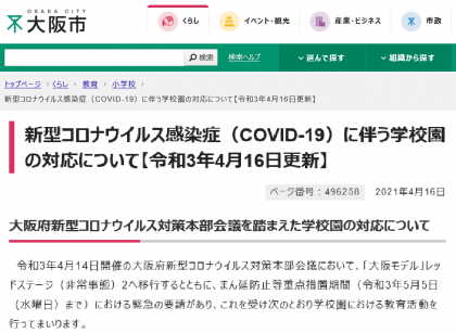 大阪市HPより〜新型コロナウイルス感染症(COVID-19)に伴う学校園の対応について【令和3年4月16日更新】〜