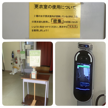 会場入り口には、地域の方からお借りしているサーモグラフィを設置し、健康観察の徹底を図っています。また、手指消毒用のアルコールも地域の方からの寄贈品と管理作業員手作りの2台を設置し万全を期しています。