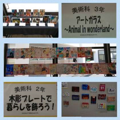 玄関ホールに生徒たちの作品が展示されています。